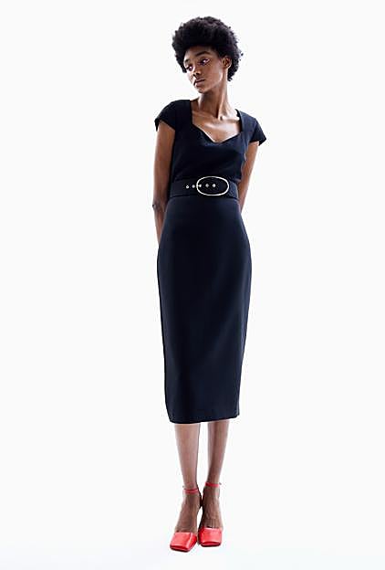 ¿La mala noticia? Que no sabemos de dónde es. ¿La buena? Que tenemos una copia low cost casi idéntica. Y la hemos encontrado en Sfera. Se trata de un vestido negro midi, también de maga corta que se diferencia en que el corte de la falda es más de tubo y queda algo más ajustada y en que tiene un bonito escote corazón. Además, lleva un cinturón con hebilla que marca la cintura y define la silueta. ¡Es ideal! Cuesta 49,99 euros y al ser de nueva colección puedes hacerte con él en cualquier talla.