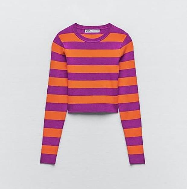 Es un diseño cropped de manga larga y cuello redondo protagonizado por un estampado de rayas en color morado y naranja. Cuesta 17,95 euros y también puedes encontrarlo en la web de la marca en color verde y blanco, en dos tonos de azul o lisos en tonos como el naranja. Sin embargo, el que más éxito promete tener es que el ha llevado Virginia.