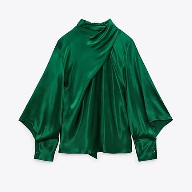 Se trata de un conjunto satinado en color verde fuerte, que está formado por una falda midi de talle alto y el bajo acabado en línea evasé que cuesta 29,95 y una blusa de lo más original. Es un cuerpo con el cuello cruzado y subido que se ajusta con una lazada en espalda. Lleva la manga larga acabada en puño con aberturas y el bajo asimétrico y cuesta 29,95 euros.