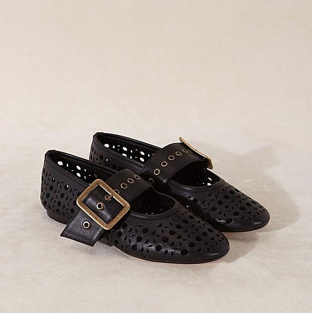 Bailarina estilo merceditas de piel calada color negro de Micuir. Con tira en el empeine y hebilla dorados, está hecha a mano en España. Precio: 219,95 euros.
