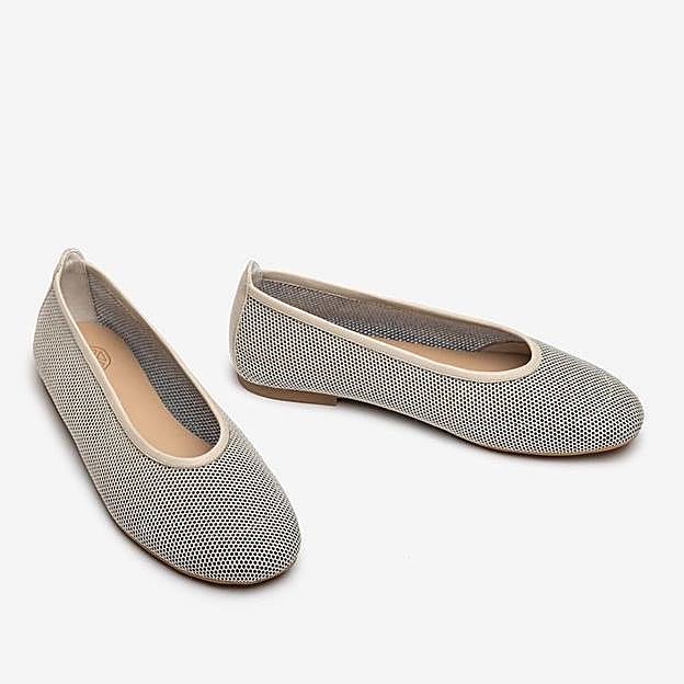 Bailarina de punta redonda fabricada en rejilla reciclada de Unisa. Tiene el ribete y talonera en piel al tono y una suela de goma ligera, flexible y antideslizante. Precio: 95 euros.