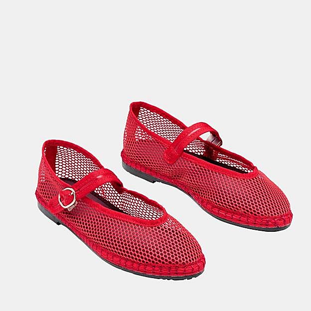 Mercedita de rejilla en color rojo de Flebelus con ribetes rojos y cierre de hebilla. La suela está hecha de caucho producido a partir de neumáticos de bicicleta reciclados. Precio: 180 euros.