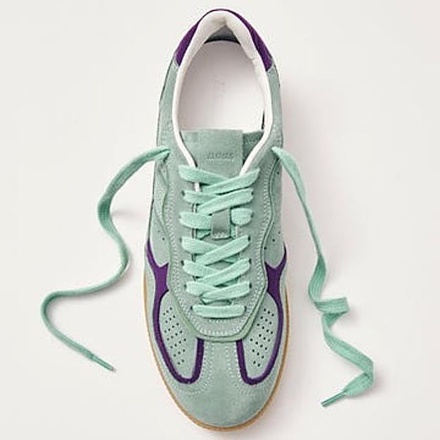 La zapatilla Tb.490, disponible en los colores vibrantes, está hecha de gamuza verde azulada con detalles en contraste en violeta. Diseñada con una silueta de caña baja sobre suelas de goma, se completa con características clásicas, como costuras expuestas y sellos de logotipo. Precio: 160 euros.