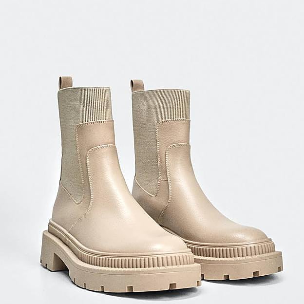Por último, el calzado que triunfo en las anteriores temporadas y que va a seguir siendo un éxito en las siguientes. Son unos botines efecto piel abatanada, en crudo. Tienen caña media, por encima del tobillo, con paneles laterales en material elástico y acanalado. La puntera es redonda. Cuenta con tiradores en la parte trasera. Y, la suela es tipo track dentada. Su precio es de 49,99 euros y, de nuevo, las tallas disponibles van de la 35 a la 42.