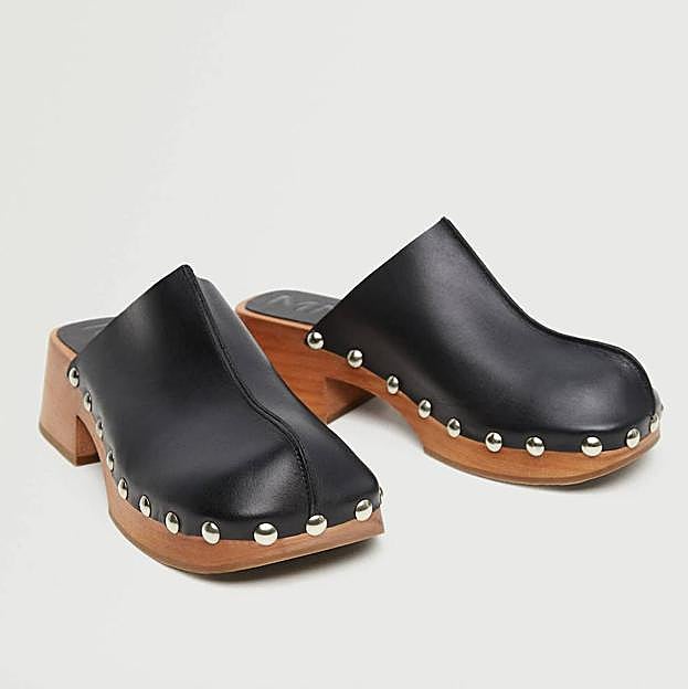 Continuamos con este modelo super tendencia que no puede faltar en cualquier época del año, sea verano o invierno. Se trata de unos zuecos en tejido de piel 100%, color negro. El diseño es de punta redonda y destalonado. Tiene detalle de costura frontal y tachuelas decorativas. La suela es de madera, en tono natural a contraste, con tacón de bloque de cinco centímetros. Cuestan 59,99 euros y los puedes encontrar del 35 al 42, pero los más grandes están agotados en la web.