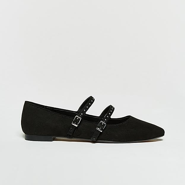 Nuestra primera opción es para el clásico negro que nunca falla y que combina con absolutamente todo con estas bailarinas tipo merceditas de ante liso y con pulseras decoradas con tachuelas en el empeine para dar un toque de estilo y sacarlo del zapato básico de toda la vida. Cuestan 16,99 euros y están disponibles en todas las tallas de la 36 a la 41.
