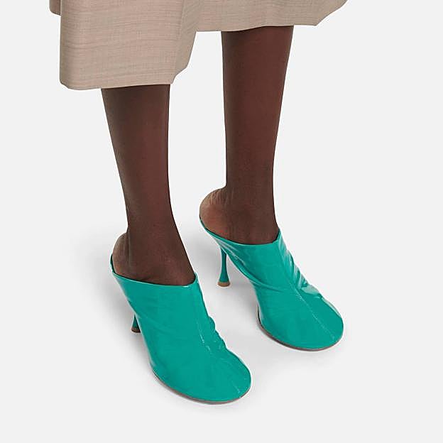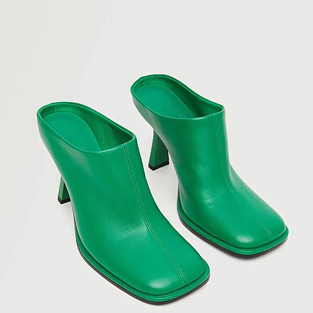 Puede que la versión de Mango, aunque muy parecida, sea incluso más estilosa que la de Bottega Venetta, debido a que tienen un diseño más pulido y su efecto piel mate lo hace parecer más lujoso (contradictorio, pero sí). Son unos mules o zapatos destalonados de tacón tipo trompeta, confeccionados 100% en piel y terminados en punta cuadrada redondeada, color verde.