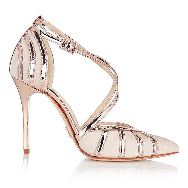 Just-Ene, la firma española que se ha convertido en un referente en el mundo del calzado nupcial y de eventos BBC, especialmente en lo que respecta a la personalización de zapatos a medida, tiene diseños que han lucido influencers y famosas en la alfombra roja como Alba Flores en los Premios Feroz. Entre los favoritos de la firma para lucir con looks de invitada está este stiletto tan ideal. De raso moiré plisado en tonos nude, cuenta con un patrón de tiras cosido a mano durante más de hora y media. Precio: 420 euros.