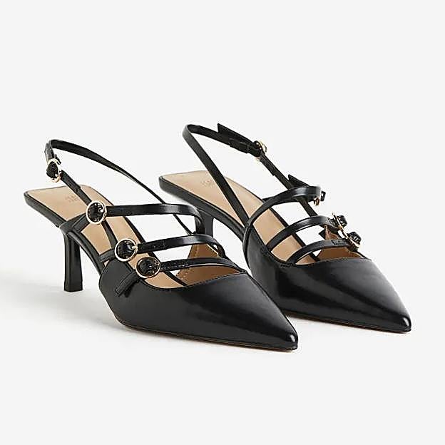 Zapatos de efecto piel con diseño con punta y tacón kitten. Es un modelo destalonado con hebillas decorativas. Precio: 39,99 euros.