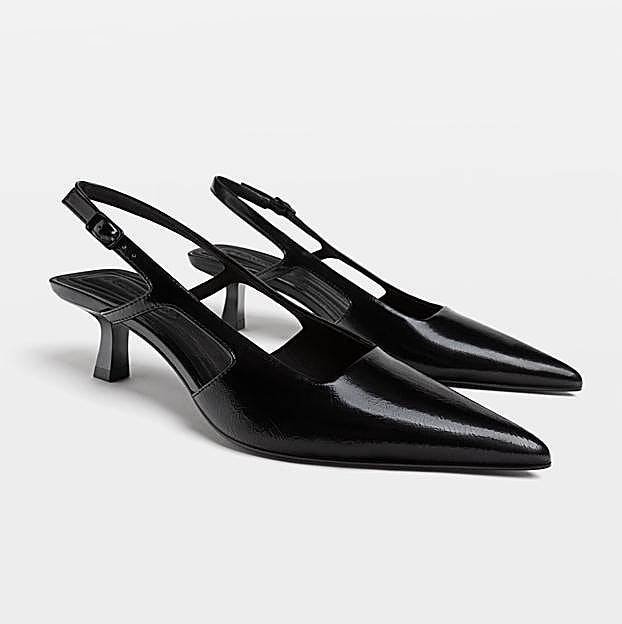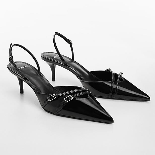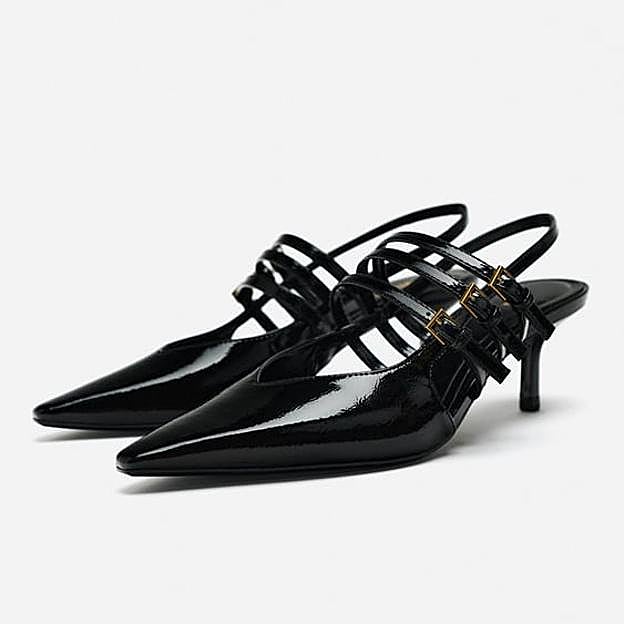 Zapato destalonado de tacón kitten con efecto acharolado. Tiene tiras finas con hebilla en la parte delantera y tira trasera y el acabado en punta. Precio: 29,95 euros.
