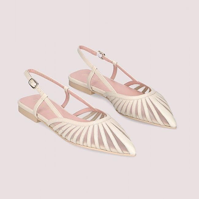 Si en tu boda quieres ir lo más cómoda posible y prefieres ir en zapato plano, puedes probar con esta bailarina destalonada de punta fina de Pretty Ballerinas. Es el mmodelo Yvette en red marfil que va combinada con napa del mismo color. Tiene suela de goma, plantilla y forro de piel. Precio: 269 euros.