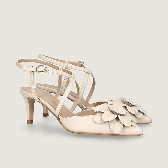 El zapato Phoebe de Mascaró tiene un tacón de 6,5 cm y está confeccionado en un suave cuero de color marfil. Destaca por el detalle de flores de cuero hechas a mano, tiene una suela de goma con plantilla y forro de cuero. Tienen pinta de ser comodísimos. Precio: 349 euros.