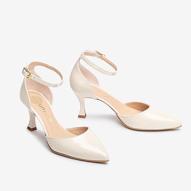 Para las más clásicas y sencillas, proponemos este elegantísimo zapato pala-talón de punta fina fabricado en charol de Unisa. Es un modelo con tacón pintado al tono de 7.5cm de altura y suela de goma ligera, flexible y antideslizante. Además, lleva una pulsera en el tobillo ajustable con hebilla metálica. Precio: 135 euros.