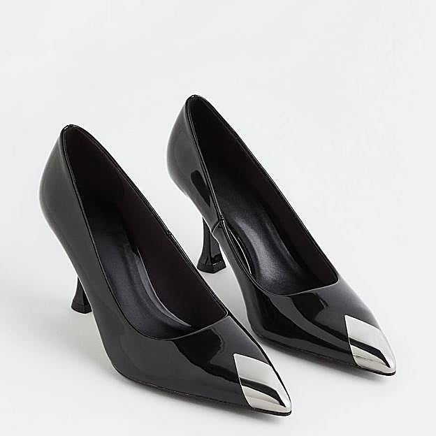 Pero, aún más asequible es la opción perteneciente a la colección de H&M. Hablamos de unos zapatos de tacón en material efecto acharolado, color negro. Tienen tacón fino con medida de ocho centímetros y terminan en punta fina con detalle metálico plateado. Su precio es de 34,99 euros, entre el 35 y el 42.