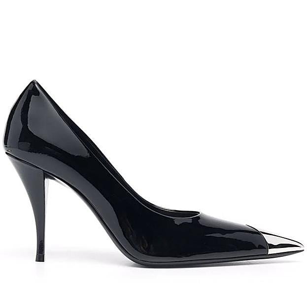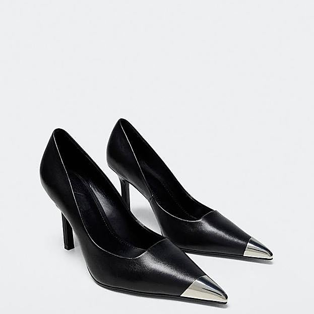 La primera, aparece en Mango. Son unos salones confeccionados en tejido 100% piel, color negro. Tienen tacón de ajuga de una altura de ocho centímetros y están decorados con aplique metálico en la punta. El precio, comparado con los anteriores, es más que un chollo, ya que solo cuestan 49,99 euros, del número 35 al 42.