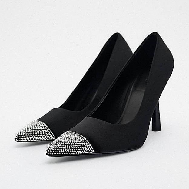 Por último, Zara apuesta por una reversión de este modelo, adaptada a las tendencias actuales, a través de estos stilettos negros con tacón alto de aguja, de nueve centímetros y medio. Están terminados en punta y esta se adorna con detalle de aplicación de brillos plata. Los encontrarás con un coste de 35,95 euros, del número 35 al 42.