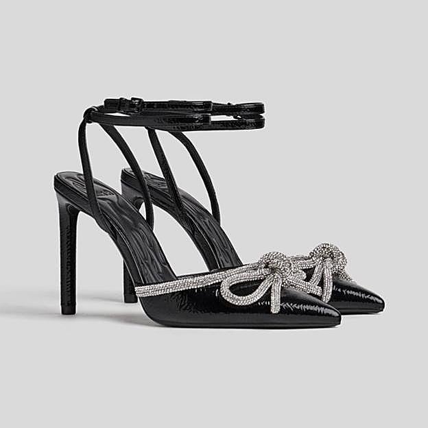 La firma de Inditex ha lanzado ya su nueva colección con los looks festivos como protagonista y no hemos podido evitar fichar unos zapatos de tacón que son de lo más bonito que vas a encontrar ahora mismo en el low cost. Se trata de un modelo de tacón fino que va destalonado y que tiene la punta triangular en color negro y con un material acharolado. Hasta ahí todo bien, un stiletto clásico abierto en la parte trasera, sin embargo, lo que hace a esta prenda especial es la lazada glitter que lleva en la parte frontal.