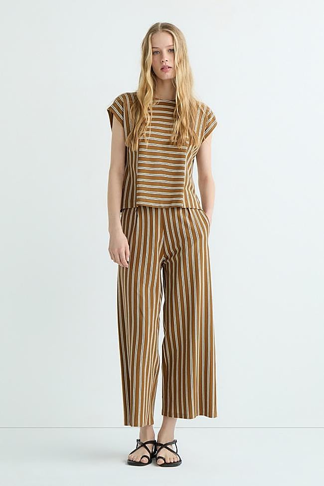 Conjunto de rayas con blusa sin mangas (17 euros) y pantalones largos (25 euros).
