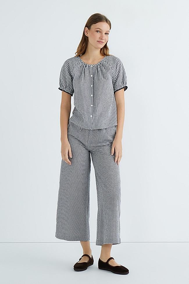 Conjunto con pantalones anchos cropped (19 euros) y blusa de cuello redondo y manga corta (17 euros).