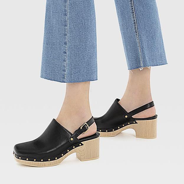 Se trata de unos zuecos de tacón medio en color negro con suela de efecto madera. Un diseño con la punta ligeramente cuadrada y que lleva el detalle de tachas plateadas en el contorno y un cierre mediante hebilla lateral en el talón. Esto último, sumado a su tacón ancho de 7 centímetros no muy alto, los convierte en un calzado súper cómodo que puedes usar en cualquier momento.