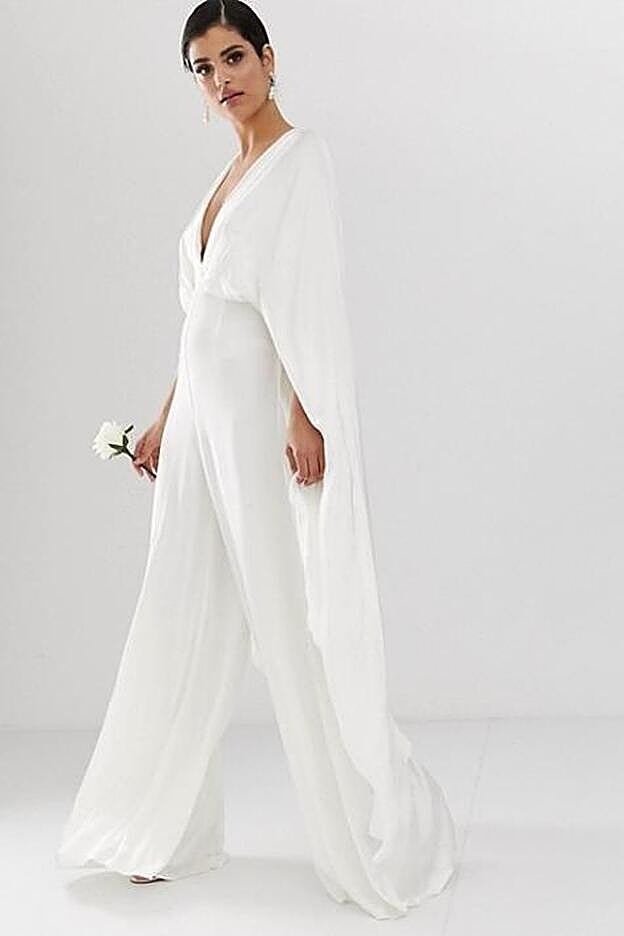 El mono de Asos pertenece a la colección Bridal, está confeccionado en satén, y tiene una favorecedora silueta con pronunciado escote en uve e impresionantes mangas capa. ¿Lo mejor? Su precio: cuesta menos de 200 euros y está disponible hasta la talla 46.