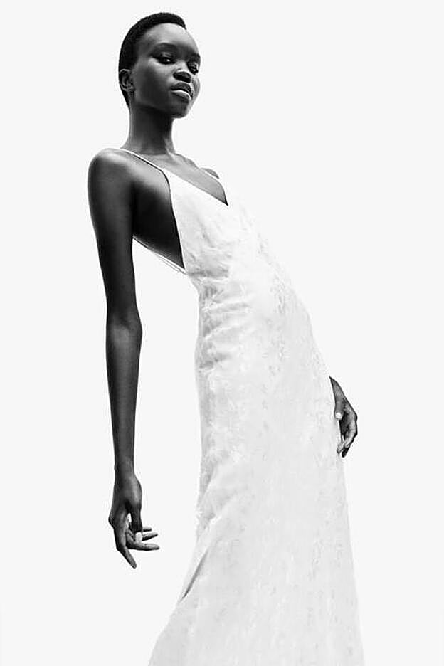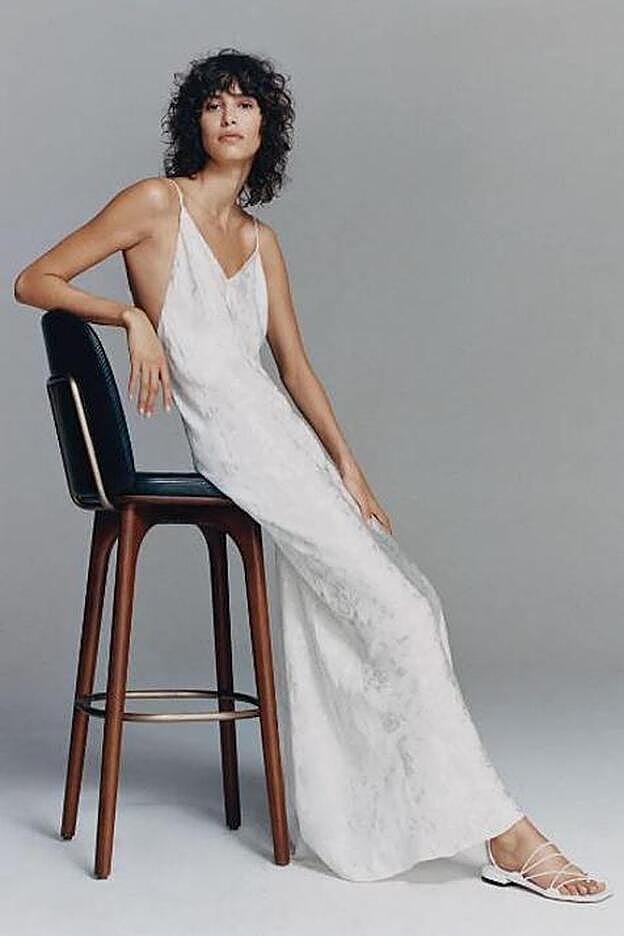 Se trata de un vestido largo fluido de corte sirena en color blanco roto. Tiene un escote pico y unos tirantes finos ajustables. Un diseño de líneas sencillas muy favorecedor caracterizado por un gran escote a la espalda que le da ese punto de sensualidad sin perder elegancia y un tejido brocado con flores maravilloso. Parece sacado de una colección de alta costura, ¿verdad? Pues su precio no tiene nada que ver con ello, porque cuesta tan solo 49,95 euros.