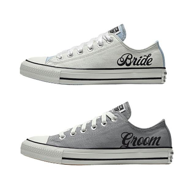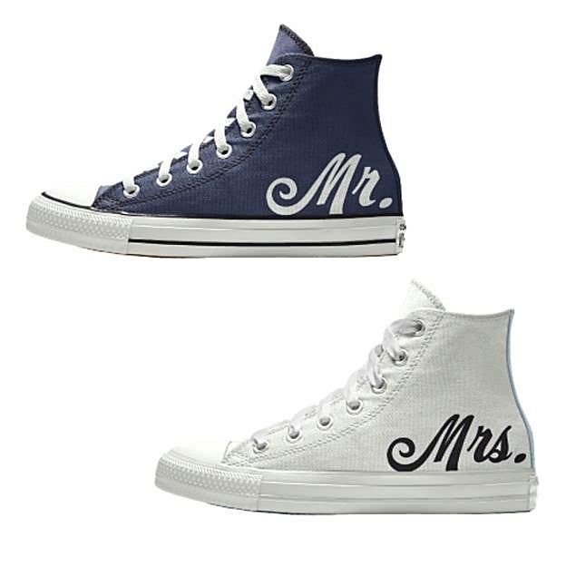 Se trata de una selección de zapatillas con el icónico modelo de Converse con caña alta y baja y que puedes personalizar con diferentes mensajes relacionados con el mundo nupcial. Están disponibles en color blanco, crudo, negro, gris azul claro o azul marino y a ellas puedes añadir unas palabras que llevan una bonita tipografía: Just Married (recién casados), I do (sí, quiero), bride (novia), groom (novio), Mr. o Mrs.