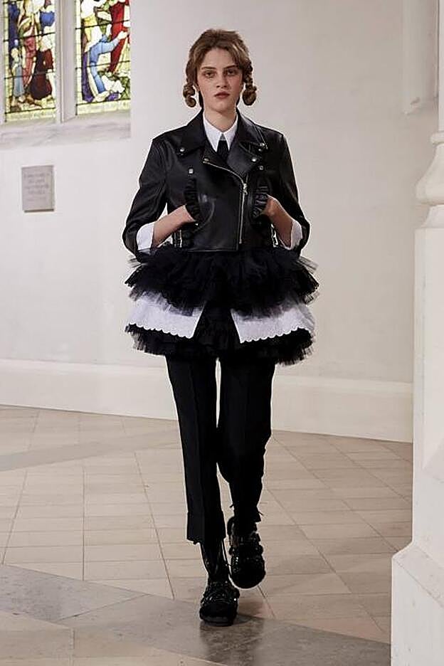 Su narrativa abarca chaquetas de cuero negro, curvadas en la cintura y con volantes que brotan de los hombros de las mangas globo de estilo eduardiano; chaquetas y vestidos con racimos de rosas de satén tridimensionales que crecen sobre ellos; y asimetrías explosivas de capas de tul rosa azúcar.