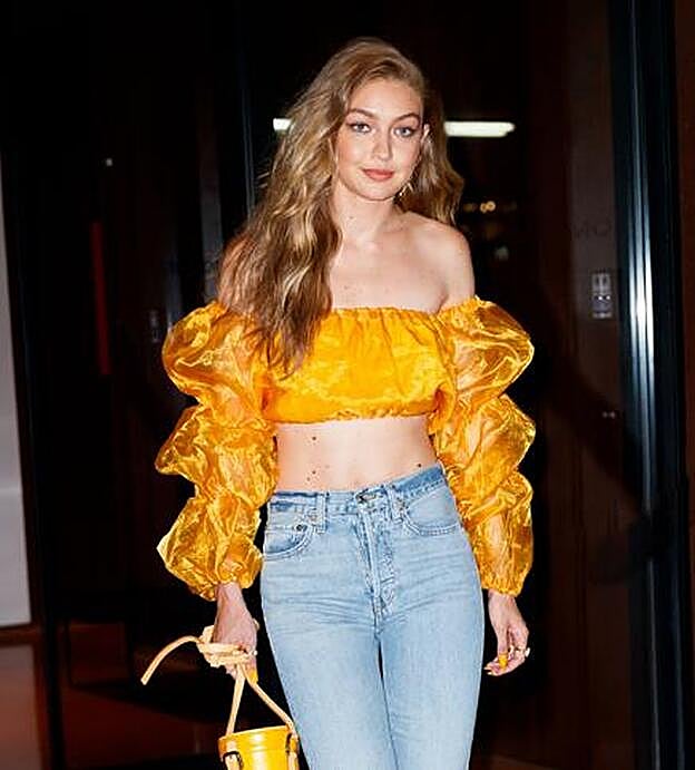 Como la modelo española, Gigi Hadid ha apostado por unos 'mom jeans' de cintura alta (que aunque a ellas no les hace falta, son perfectos para estilizar la silueta) con bajo deshilachado y, en su caso, ligeramente acampanados en un guiño muy 'setentero', y lo ha combinado con un impresionante 'crop top' de chiffón de seda en amarillo con escote 'off the shoulders'.
