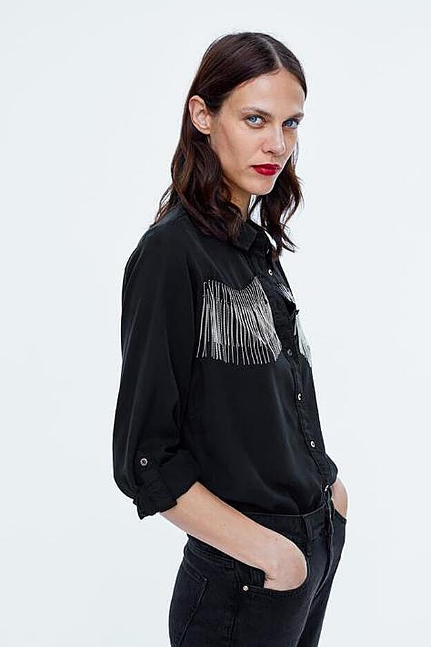 Esta camisa negra con flecos metálicos de Zara es ideal dar movimiento a tus looks. Precio: 39,95 euros.