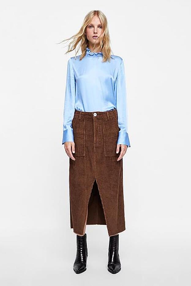 Se trata de una falda lápiz (39,95 euros), de largo midi y con una gran abertura frontal, confeccionada en pana marrón. Tiene, además, cuatro bolsillos en plastrón, dos delanteros y dos traseros, lo que junto a la factura gruesa de la pana le da un toque rústico interesante. Por sí sola la falda es resultona, pero lo que nos ha encantado ha sido todo el estilismo que nos propone Zara. El look entero es de diez.