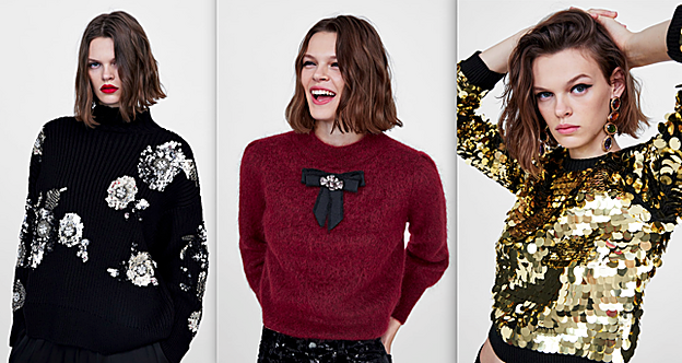 Otros tres jerseys de Zara nos han llamado muchísimo la atención por su capacidad para elevar un look de sencillo a sencillamente original. El primero lleva una aplicación de lentejuelas plateadas en forma de flor sobre punto negro, en un diseño oversize con cuello subido (49,95 euros). El segundo, color burdeos, con manga abullonada y largo hasta la cintura, apuesta por un aplique compuesto por un doble lazo y una joya (39,95 euros). El tercero es directamente una fiesta: está totalmente recubierto de grandes lentejuelas doradas (49,95 euros).