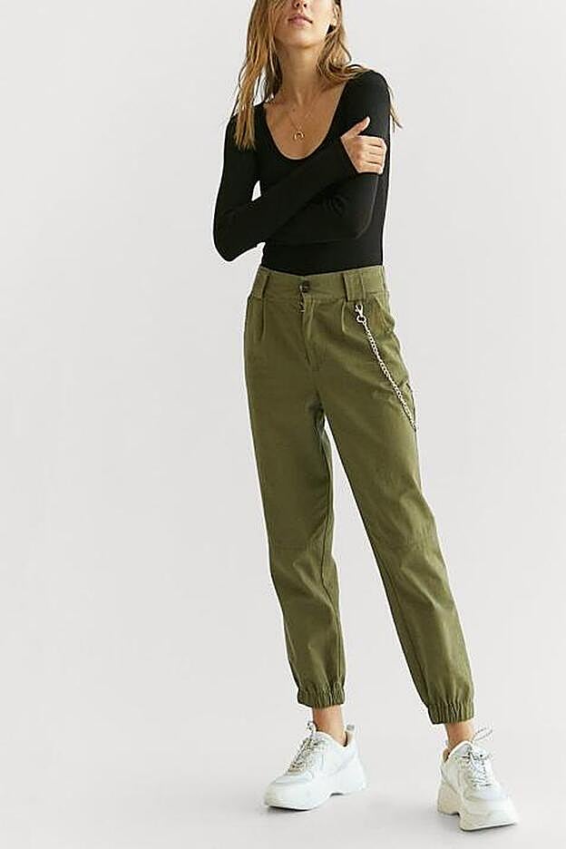 Stradivarius combina su preciada "biker" con unos fantásticos pantalones "flare" de pana (19,99 euros) y unos botines con estampado serpiente (35,99 euros). Sin embargo, como nuevo pantalón de cara a lo que queda de invierno nos quedamos con el espíritu militar de su nuevo pantalón de sarga, adornado con una cadena (19,99 euros), fantástico combinado con unas zapatillas deportivas con la suela XXL (39,99 euros). Queda perfecto con un simple "body" de canalé escotado (9,99 euros). Nos encanta esta actualización de la tendencia con el verde caqui como bandera. Punto para Stradivarius.