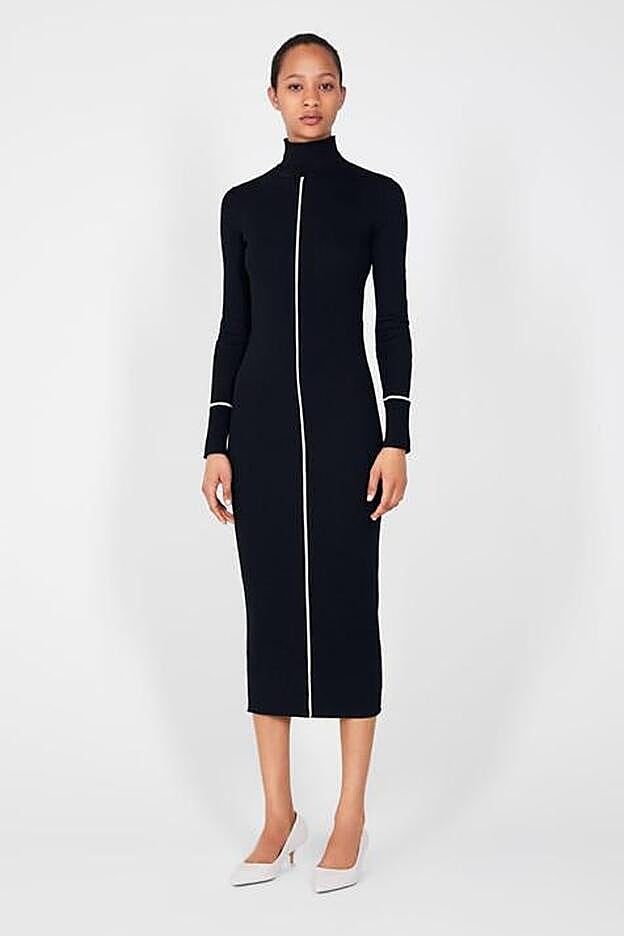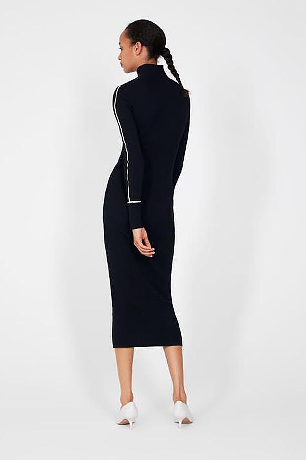 Se trata de un vestido en punto de canalé negro que tiene tres 'trucos' que nos sacan tipazo. Por un lado, el color, con ese efecto mágico del negro capaz de reducir volúmenes en el lugar adecuado; por el otro, la silueta lápiz y el largo midi, capaz de potenciar nuestras curvas. Y, por último, esa costura blanca estratégicamente colocada en el eje central del cuerpo, que da verticalidad a la figura y la alarga y estrecha al mismo tiempo.