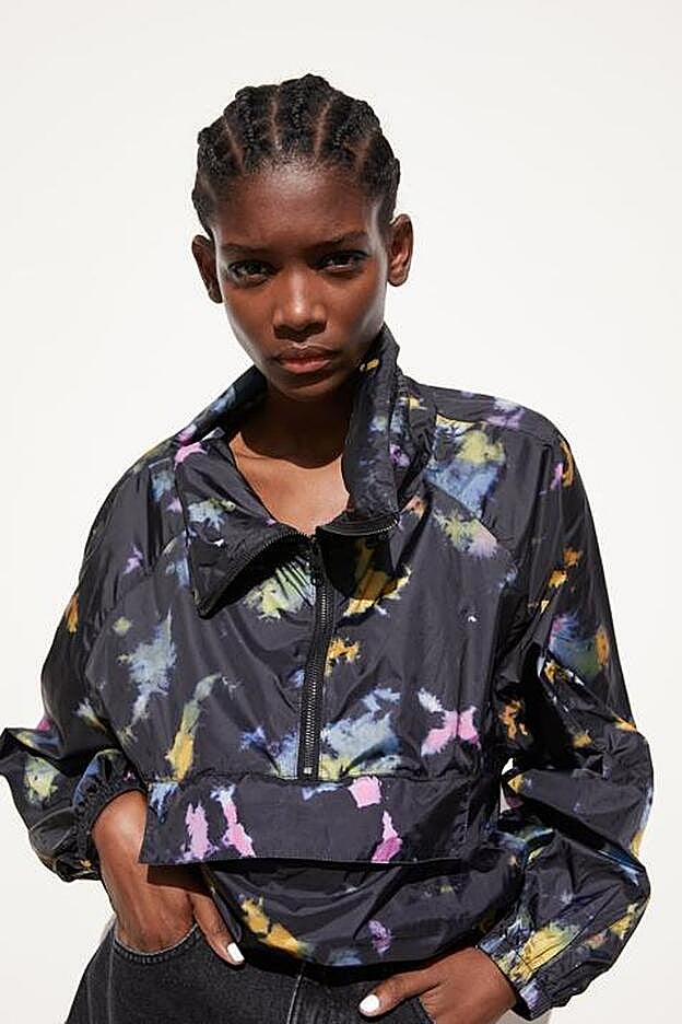 Puede que este sea el cortavientos más estiloso de la selección: además de ser chubasquero, el estampado de manchas de colores sobre negro funciona genial en estilismos con prendas más sofisticadas o directamente no deportivas (Zara, 25,95 euros).
