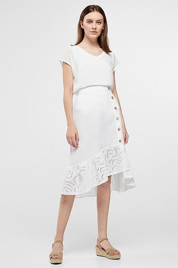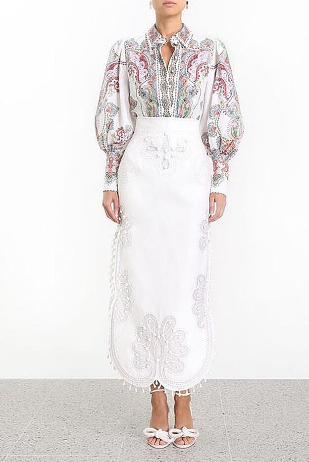 Nada más sencillo que un look de verano en blanco como el de Belén Hostalet, con una camiseta básica de algodón y la falda con mayúsculas: un imponente diseño midi de Zimmerman con cintura marcada, en lino bordado y sensuales aberturas laterales rematadas con detalles de joya en forma de lágrima. Si te estás preguntando su precio, que sepas que esta maravilla está rebajada de 1.995 a 1.400 euros.