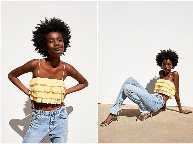 Nos referimos al crop top de tirantes amarillo confeccionado en tul y con varias capas de volantes... Lo hemos visto con falda, pantalones largos, y es justo este el look que nos había convencido desde el principio, y que ahora no podremos llevar, salvo que logrm¡emos dar con esta prenda en alguna de las tiendas físicas... No nos extraña nada que esté agotado: su precio inicial era de 19,95 euros y se rebajo hasta los 12,99 euros... ¿Quién puede resistirse a semejante precio?