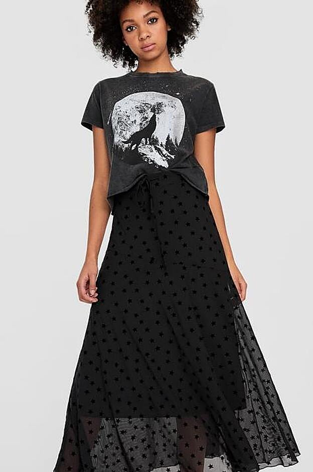 Con su favorecedor largo midi con vuelo hemos tenido un auténtico flechazo al toparnos en el catálogo de Stradivarius con esta falda de plumetti negra con ligeras transparencias y estampado de estrellas a tono que cuesta menos de 20 euros (19.99 euros), se está empezando a agotar en algunas tallas y que nos promete alguno de nuestros mejores looks durante los próximos meses.