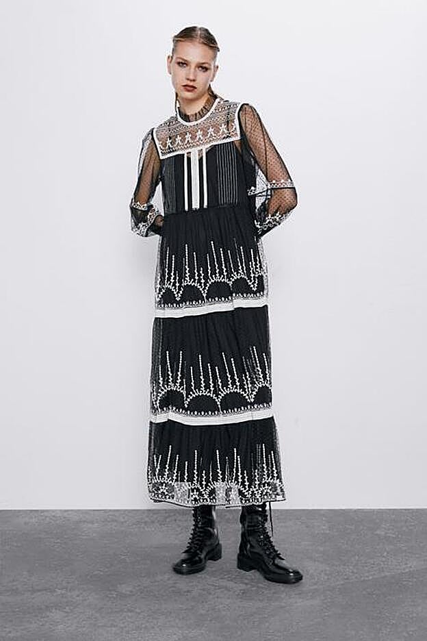 Con un favorecedor largo midi, el vestido de Zara que nos ha enamorado es un diseño en tul plumetti negro con bordados en blanco que cuesta 49.95 euros, y que ya ha empezado a agotarse en algunas tallas (la L y la XL tienen ya lista de espera).