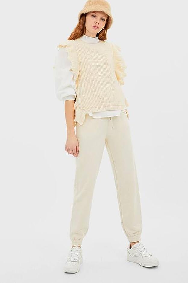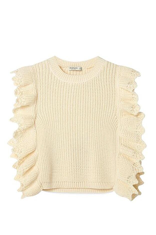 Se trata de un chaleco de punto con volantes en tono vainilla de la nueva colección de Stradivarius que queda genial con camisa, que quedará genial en solitario cuando llegue el buen tiempo y consigas ese tono de piel bronceada tan irresistible, y que favorece al máximo si lo combinas con pantalones vaqueros.