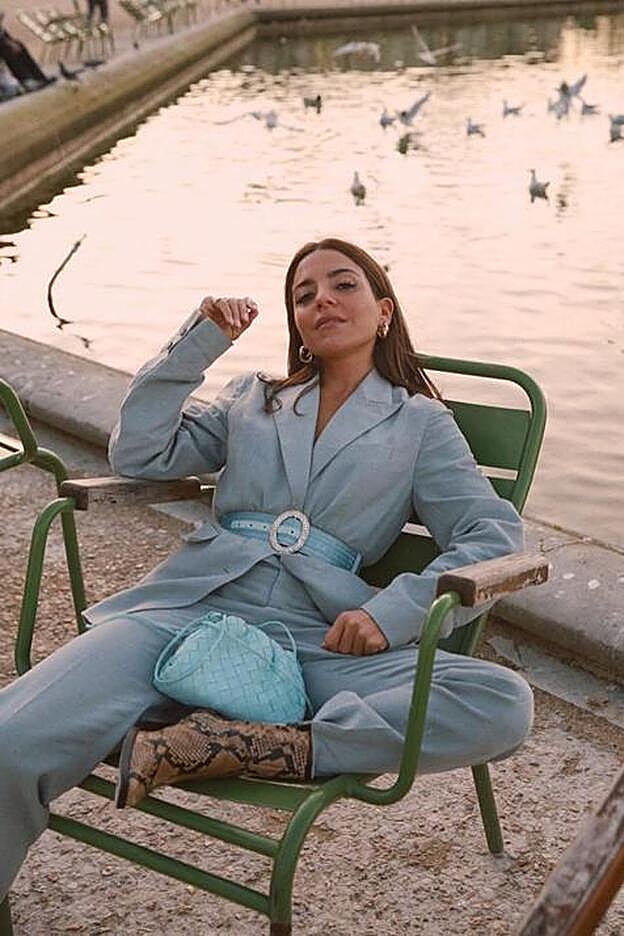 En ocasiones, la fuerza del traje radica en realidad en los accesorios, que esta temporada se vuelven divertidos y salvajes. Paula Ordovás accesoriza su modelo de Uniqlo con cinturón de Redondo Brand, bolso de Bottega Veneta y botines de estampado de serpiente.