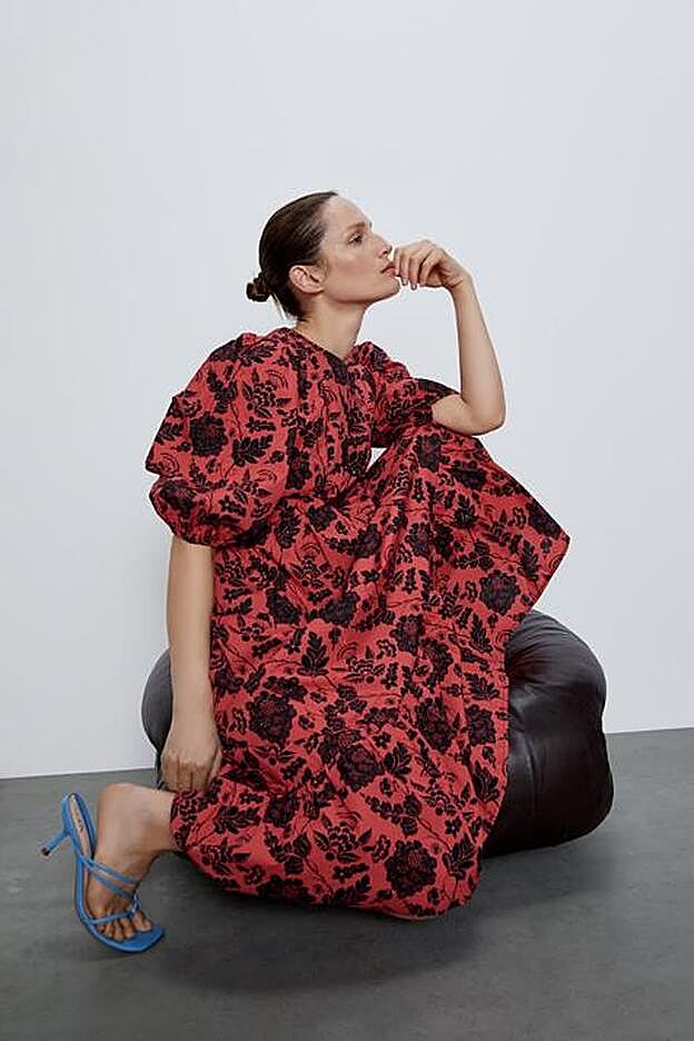 El vestido de Nagore Robles es una de las incorporaciones primaverales de la firma de Inditex y, actualmente, está rebajado. Con cuello redondo y manga por debajo del codo acabada en elástico, combina el color rojo con una bonita aplicación de lentejuelas y bordados con motivos florales.