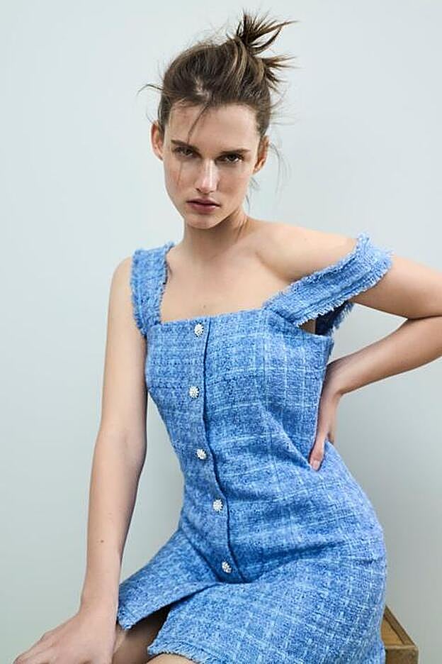 El vestido azul de tweed de Nagore Robles tiene un precio de 49,95 euros y está disponible únicamente en las tallas L y XL, aunque según la página web de Zara está previsto que regrese en la talla S.