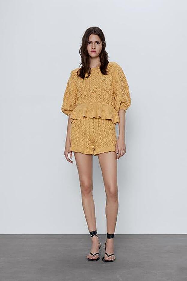 Los shorts son de tiro alto y tienen la cintura elástica. Y en cada pierna acaban con un ligero volante, al igual que el jersey. Cuestan 19,95 euros y están disponibles en las tallas S, M y L.