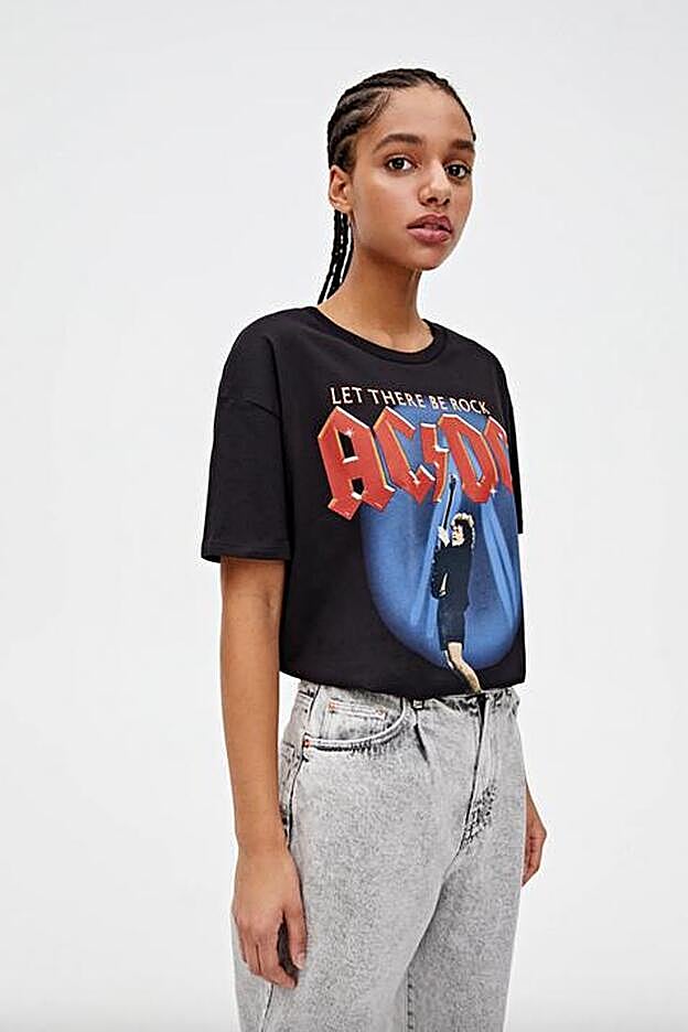 La camiseta rockera de Nagore Robles, en homenaje a AC/DC, pertenece al catálogo de Pull&Bear. Con cuello redondo y manga corta, tiene un precio de 15,99 euros y está disponible entre las tallas XS y XL.