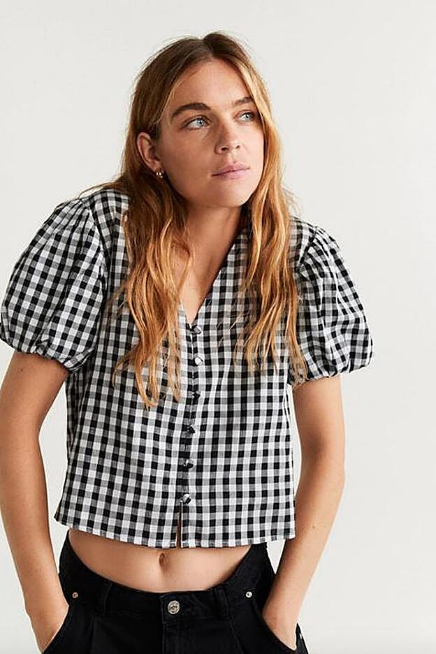 Aunque las diferencias con la prenda de María G. de Jaime son evidentes, Mango tiene una blusa cropped con mangas abullonadas cortas que se parece mucho a su propuesta.