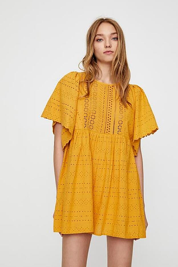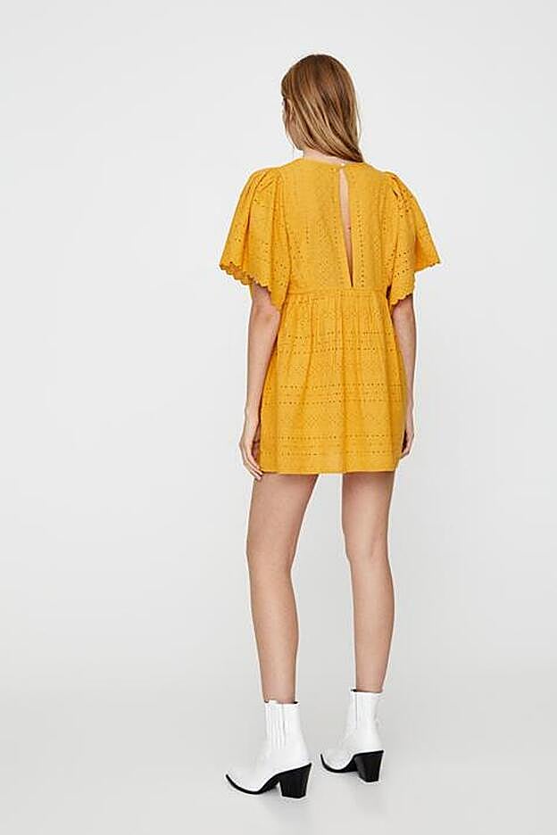 Si los efectos ópticos son lo tuyo, has llegado al lugar indicado. Buceando en la página web de Pull&Bear hemos dado con un supuesto mono troquelado de color mostaza de manga con volantes y corto, ideal para el verano. Aunque en la descripción del producto está clasificado como un mono, nosotras no lo hemos podido evitar... lo vemos como si fuera un mini vestido.