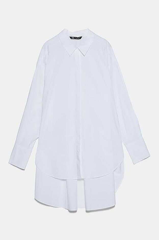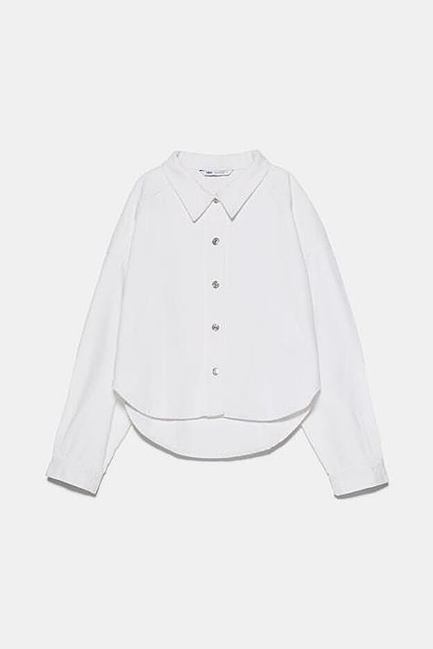 La última colección de la firma de Inditex ha apostado por el diseño oversize para esta prenda, aunque son muy diferentes. Por un lado, tenemos la camisa popelín con cuello de solapa y manga larga acabada en puño con pliegues. Con cierre de botones delantero con botones ocultos por una solapa, esta camisa de diseño largo tiene el bajo ampliamente asimétrico. Cuesta 22,95 euros y está disponible entre las tallas XS y XXL.