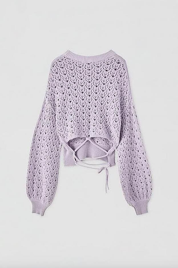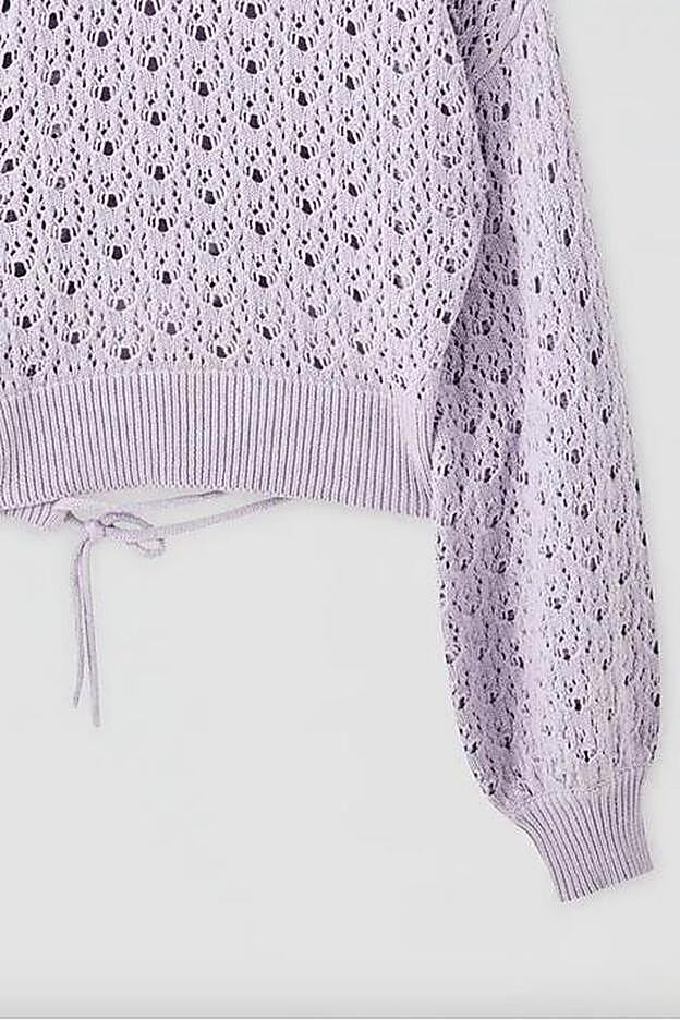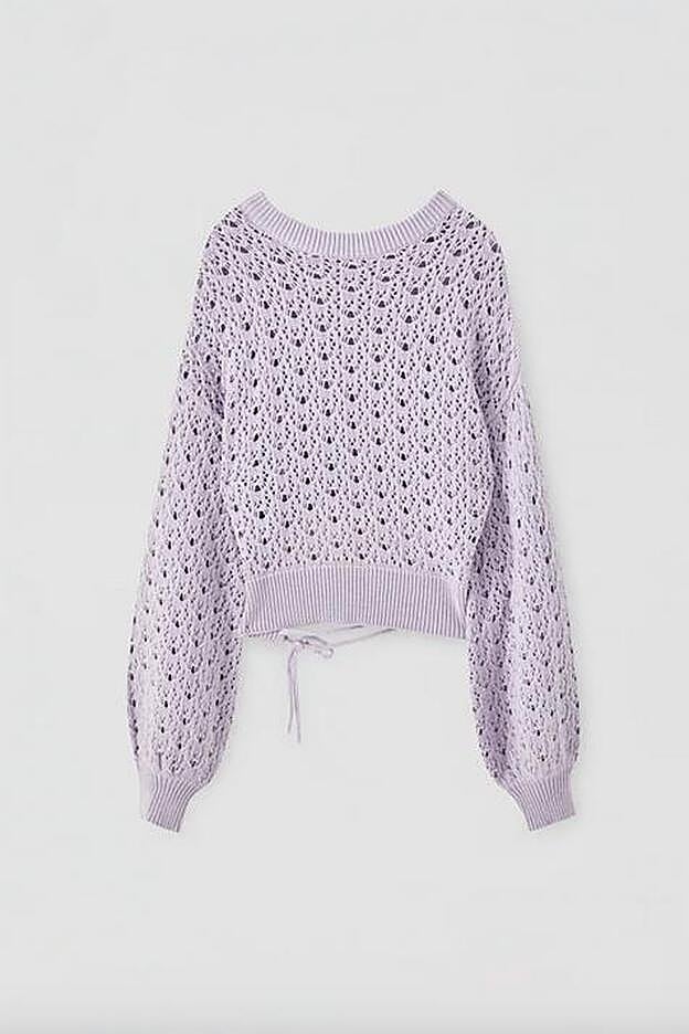 Este bonito jersey lila calado tiene un precio de 22,99 euros y está disponible entre las tallas XS y L.