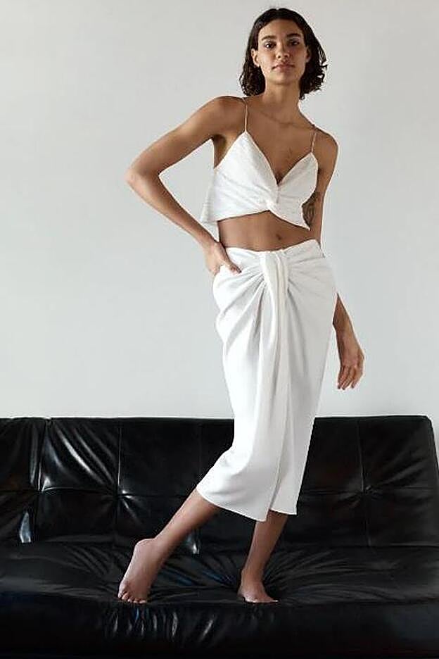 Un diseño midi muy original en color blanco con bajo asimétrico, tiro alto y nudo en la cintura que sienta de maravilla. Cuesta 29,95 euros y también está disponible en color negro. Nagore añadió además el toque llamativo con el calzado completando el look con unos stilettos de estampado de leopardo. ¡Nos encanta!